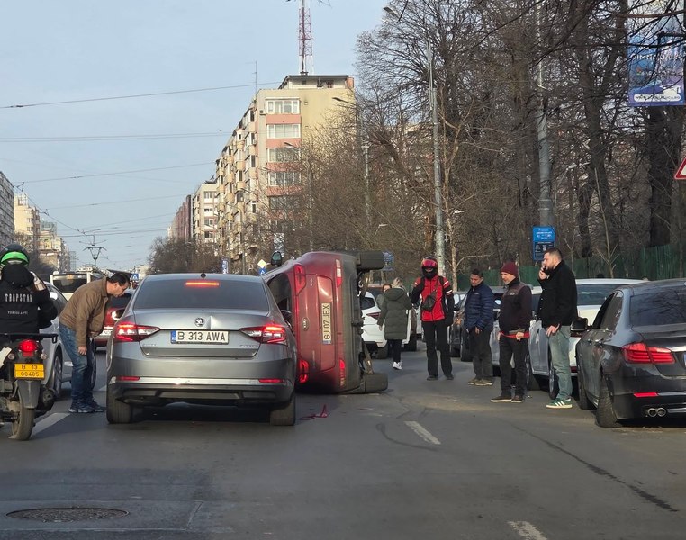 Accident grav în Capitală. O mașină s-a răsturnat miercuri dimineață, pe Șoseaua Ștefan cel Mare, în dreptul Spitalului Clinic Colentina, în urma unui accident în care au fost implicate șase autovehicule. O femeie de 56 de ani a fost rănită și transportată la spital.