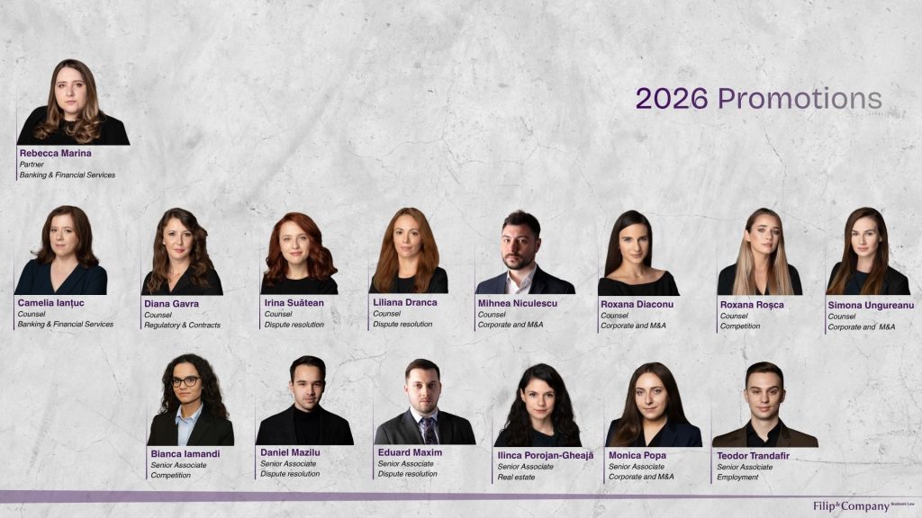 Casa de avocatură Filip & Company anunță o nouă rundă de promovări în cadrul firmei, începând cu această primăvară. Promovările reflectă evoluția profesională a unor avocați care au avut contribuții excepționale la creșterea și la dezvoltarea echipei și a portofoliului de clienți.